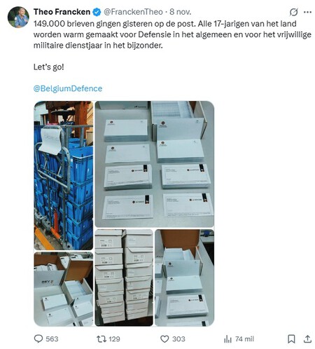 Mediados de 2025 (el Post lo sabe) no suele ser una novedad. Sin embargo, existen en Bélgica. alrededor de 150.000 cartascon los correspondientes sobres, direcciones y membretes que se regalan mucho de que hablar. Lógico, teniendo en cuenta que quien los envía es el Ministerio de Defensa y que sus destinatarios son miles de jóvenes belgas de 17 años a los que el Gobierno quiere animar a alistarse en el ejército o al menos completar un año de “servicio militar” voluntario.