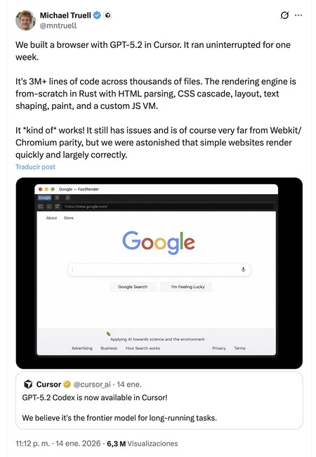 Cursor ya lo ha demostrado. Antes de que Anthropic lanzara su compilador programado por IA, Cursor completó un proyecto similar, combinando agentes GPT 5.2 en su plataforma de desarrollo para crear un navegador funcional en una semana. En total, la IA programó tres millones (!) de líneas de código en Rust y, aunque, nuevamente, estaba lejos de ser perfecta o competitiva con Chrome, demostró las capacidades actuales de estos sistemas de programación de agentes.