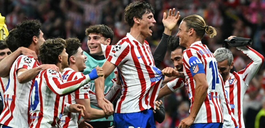 El centrocampista argentino del Atlético de Madrid Nico González (número 23) y sus compañeros celebran el final del partido de vuelta de los cuartos de final de la Liga de Campeones de la UEFA entre el Club Atlético de Madrid y el FC Barcelona en el Estadio Metropolitano de Madrid, el 14 de abril, en Madrid. Semifinales de la Liga de Campeones. (Foto de Thomas COEX / AFP)