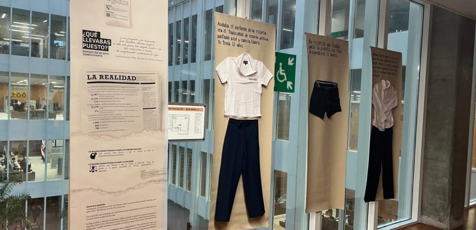 Un uniforme escolar, una pijama, un traje de superhéroe y un vestido largo cuelgan desde esta semana en la Asamblea Legislativa como parte de la exposición «¿Qué vestiste?».