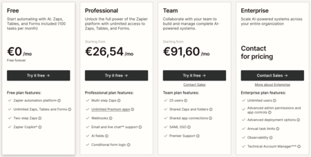 Y luego está una cuenta de equipo por 91,60 euros al mes para hasta 25 usuarios con 2.000 acciones al mes, donde además de todo lo de la versión de pago, también podrás compartir Zaps y conexiones entre todos los miembros del equipo.