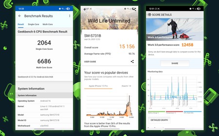 En cuanto a sus test de rendimiento, sobre todo cuando le comparamos con otros terminales, se aprecia que el Exynos 2400 no es ni de lejos el mejor procesador. De hecho, supera por muy poco lo obtenido por su antecesor (incluso queda por debajo en la puntuación de PCMark). Ahora bien, quiero decir que en la experiencia de uso, estos datos no le hacen justicia. Es un procesador con carencias, pero no nos hace percibir que tenga un mal rendimiento en general.