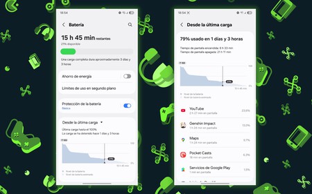 En esa tesitura de uso intensivo, el Galaxy S25 FE cumple con creces. Con 120 Hz de pantalla, usando el móvil como GPS, haciendo llamadas, usando apps de mensajería, tirando muchas fotos y vídeos y jugando a juegos exigentes he llegado a las seis horas y media de pantalla con un 21% de batería, por lo que todavía me duró más. Y con un uso menos exigente, perfectamente ha llegado a las siete horas y media.