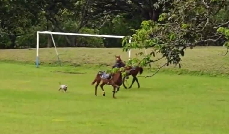 Un video que circula en las redes sociales muestra a un perro persiguiendo a un caballo de la Policía Montada.